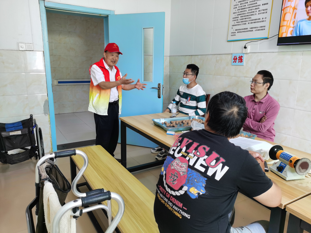 在手工车间,“全国好人”李子明,兴致勃勃参观了托养中心的手工工厂,与残疾人朋友愉快交流,工厂里摆满了残疾朋友们制作的串珠等手工艺品,他们在享受劳动创造的快乐和价值。