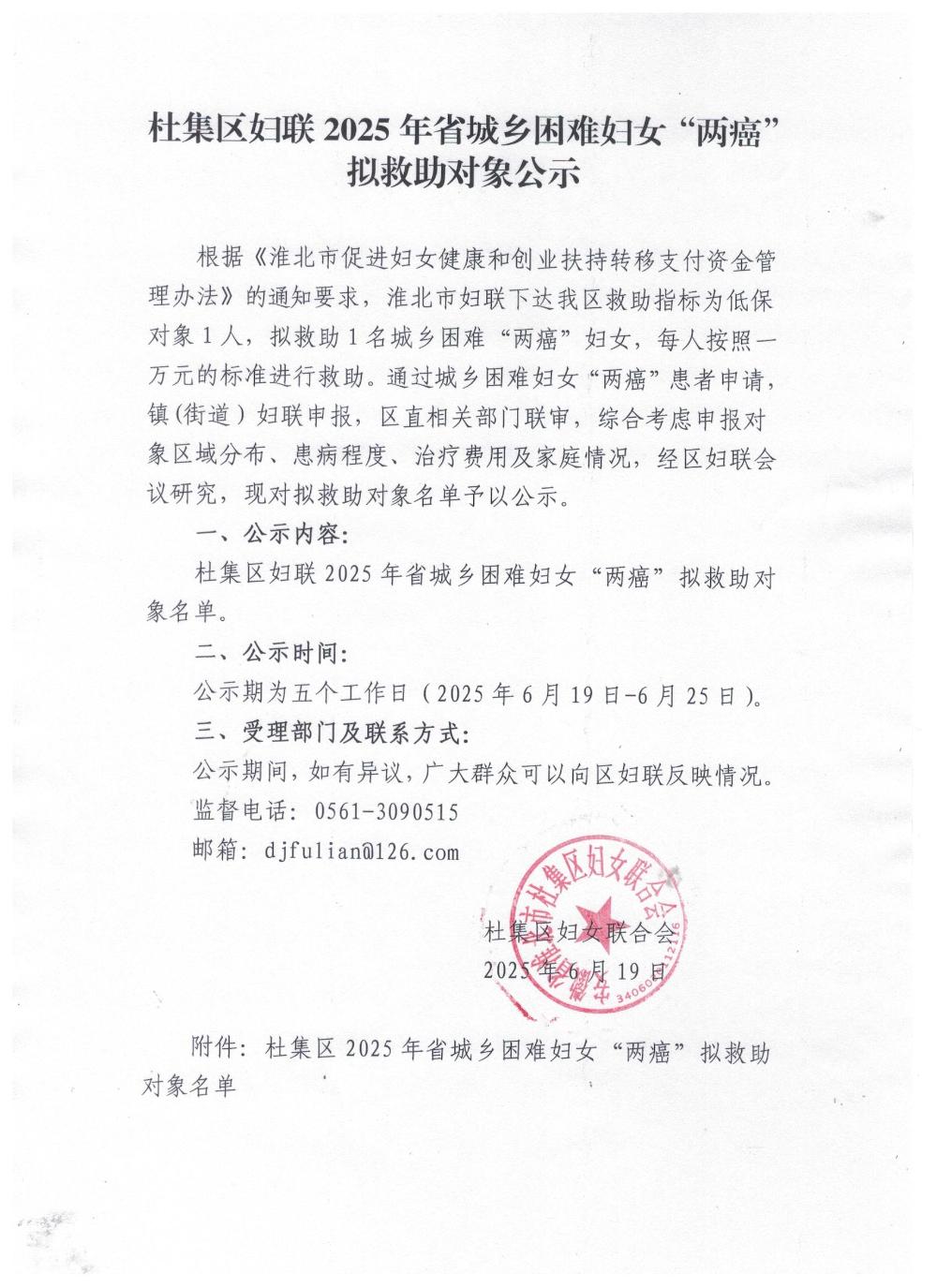 杜集区妇联2025年省城乡困难妇女“两癌”拟救助对象公示