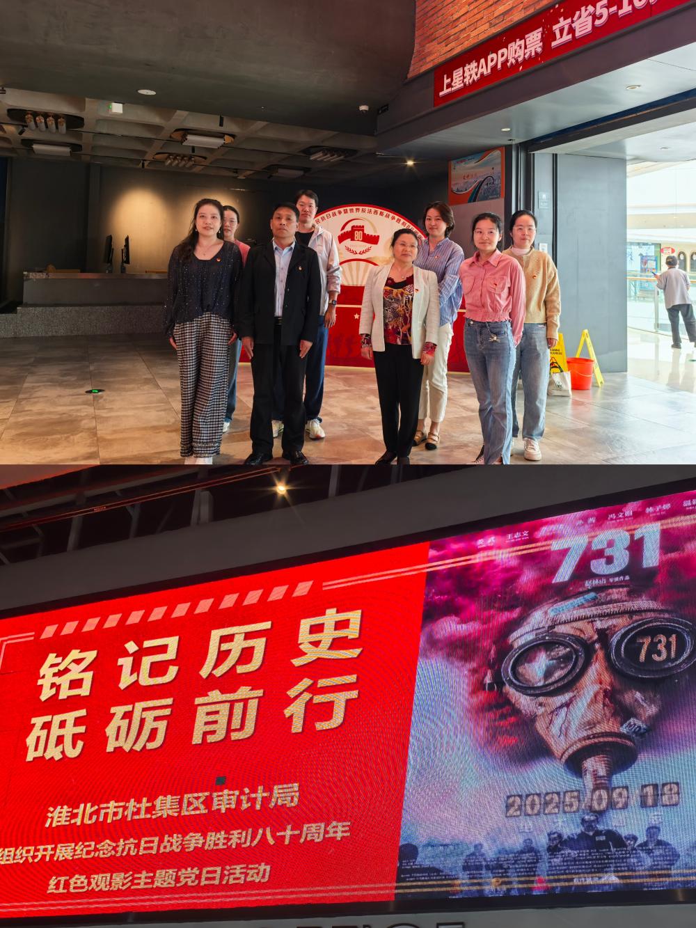 在中国人民抗日战争暨世界反法西斯战争胜利80周年之际,9月26日淮北市杜集区审计局组织全体党员干部开展主题党日活动,集体观看纪录片《731》,铭记历史、传承抗战精神。