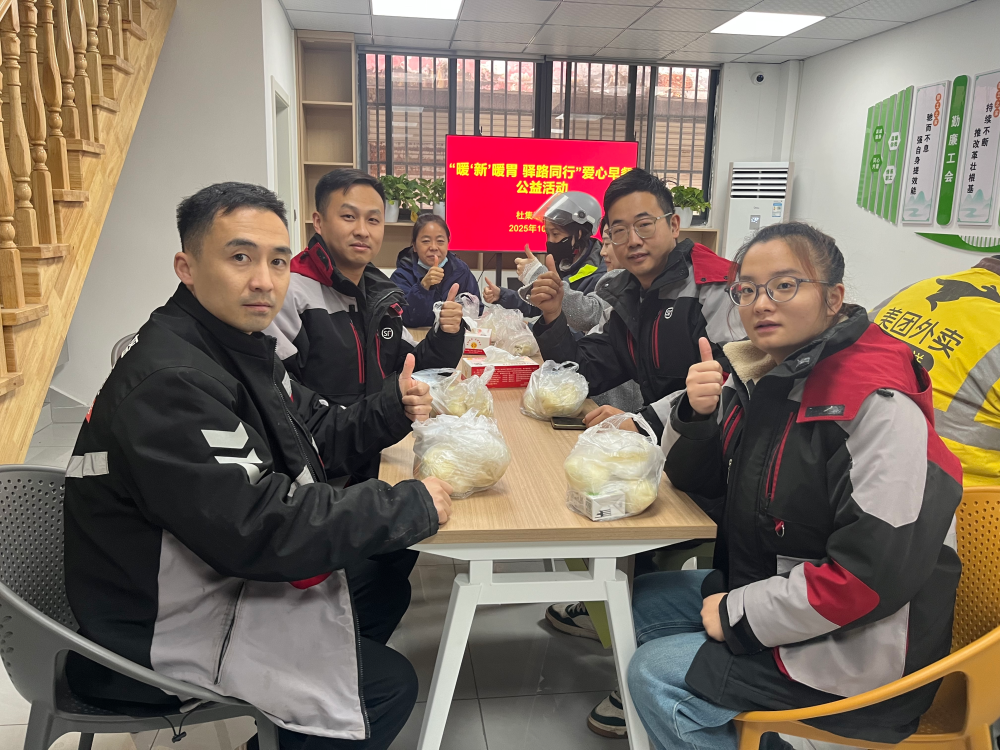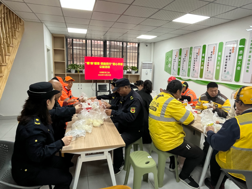 近日,杜集区总工会在职工服务中心工会驿站开展“暖‘新’暖胃 驿路同行”爱心早餐公益活动,为奔波在城市一线的环卫工人、快递小哥、外卖员、网约车司机、城管等30余名户外劳动者,送上了一份热气腾腾的清晨关怀。