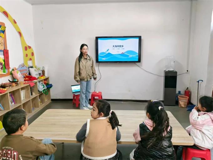 音乐教育环节,《大海啊故乡》的悠扬旋律缓缓流淌。志愿者巧妙运用海浪手势,引导孩子们逐句模唱“是我生长的地方”,稚嫩的歌声中满是对家乡的真挚情感。为了让孩子们更深入地感受音乐魅力,活动还设计了模拟波浪律动、分小组合唱等互动形式。在后续的画大海、分享故乡故事延伸活动中,音乐不再是单纯的旋律,更成为了联结亲情与乡愁的情感纽带,让孩子们在艺术熏陶中收获温暖与成长。
