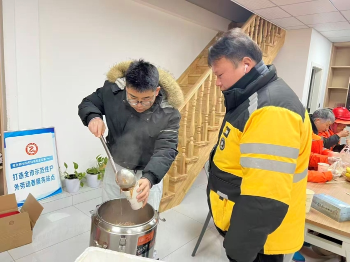 依托阵地服务,温暖直达身边。充分发挥工会驿站暖心阵地作用,在全区各驿站同步开展腊八送暖、公益早餐等服务,为环卫工人、网约车司机、快递员等户外劳动者送上热粥、早餐、水果、慰问品,让劳动者随时能“歇歇脚、充充电、暖暖身”。开展“最美工会驿站管理员”评比及慰问活动,为最美站长送上米油等物资,肯定他们值守在一线的奉献,鼓励持续提升驿站服务质效,让阵地成为职工身边的温馨港湾。2026年以来,依托驿站开展送温暖活动10余场,服务户外劳动者300余人。