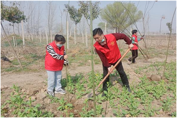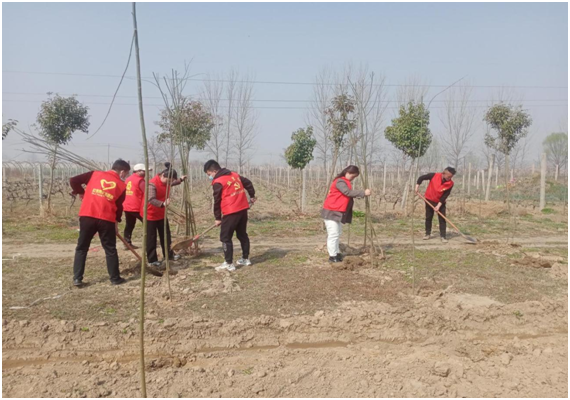 3月11日上午,段庄村党员志愿者、青年志愿者、巾帼志愿者们在村部苗圃基地参加植树活动,大家有序分配各项任务。身强力壮的男同志们承担了挖土坑这一力气活,每人一把铁锹,争先恐后的挖树坑,一个个的树坑很快就全部挖好了,而负责分栽树苗的女同志也不甘示弱,她们把一棵棵树苗栽进挖好的树坑中。在大家互相帮助下,三百多棵树苗栽种完成。