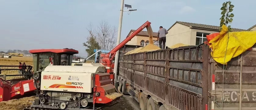 在稻田收割现场,饱满的稻穗不断卷进收割机,脱粒、扬壳、装车一气呵成。“今年又是一个好收成啊,每亩产量高达1000余斤!”段园镇毛场村党总支书记、合作社理事长赵常周看着一辆辆装满稻谷的卡车高兴地说道。