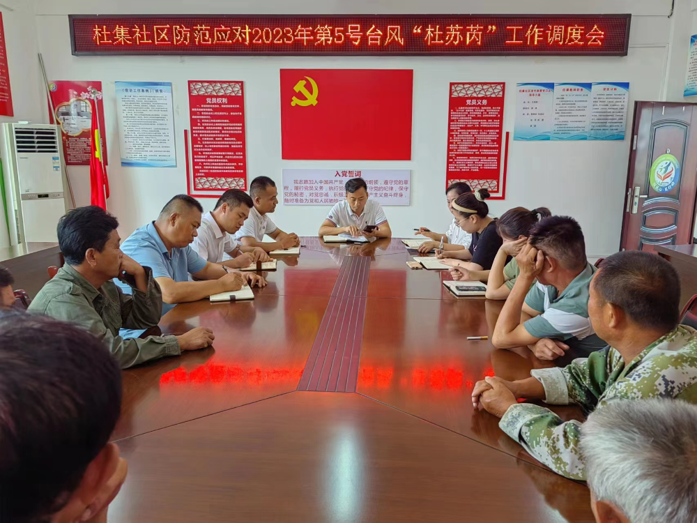 抓好安排部署。矿山集街道副主任、杜集社区包村组长金存折召开杜集社区防范应对2023年第5号台风“杜苏芮”工作调度会,结合社区实际,围绕隐患排查、物资储备、应急队伍、值班值守、避灾点设置等方面全面安排部署社区各项防御工作,并快速组织社区工作人员开展各项防御工作。