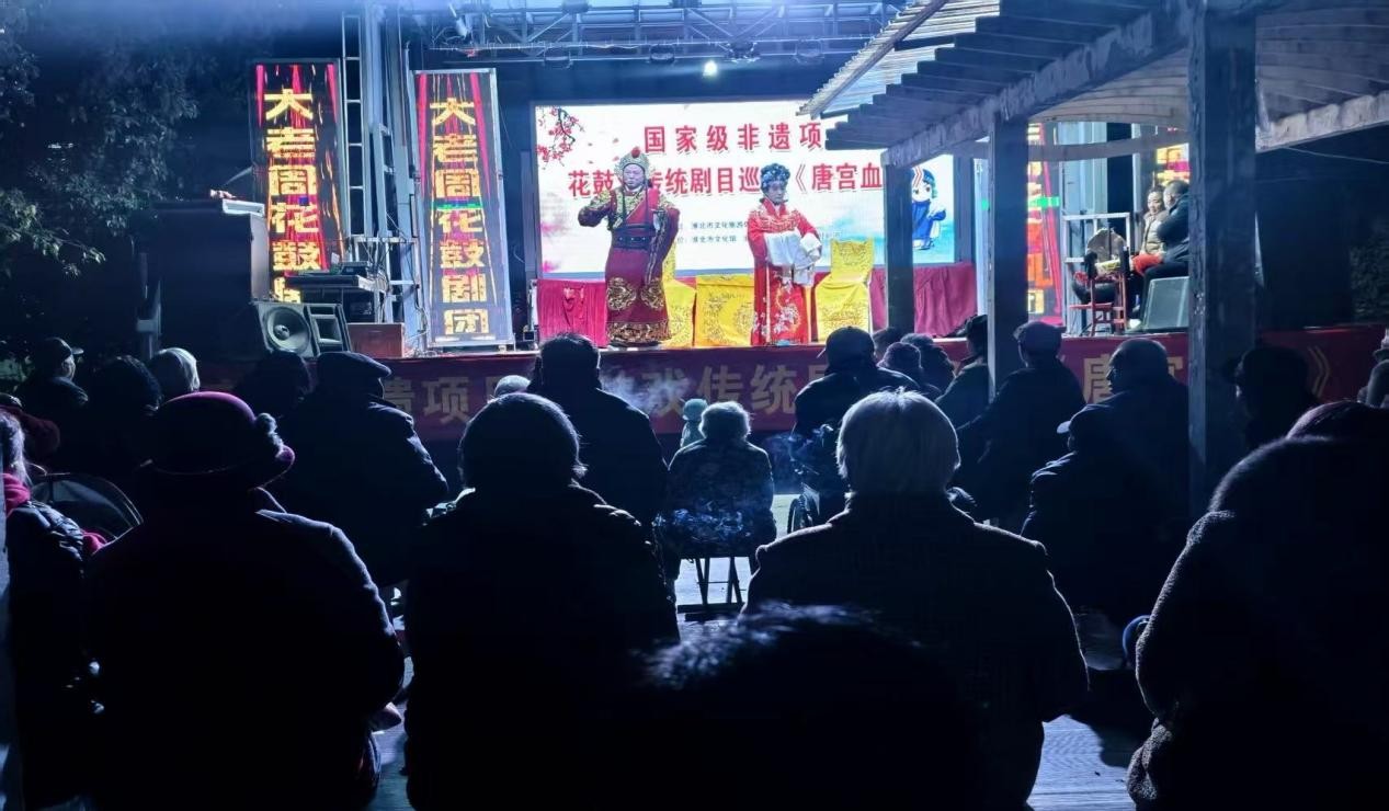傍晚的社区文化广场上,红色舞台早已搭建完毕,周边摆满了居民自带的小马扎。随着一阵清脆明快的花鼓节奏响起,演出正式拉开帷幕。演员们身着绣工精美的戏服,头戴珠翠头饰,一亮相便引来台下观众的热烈掌声。表演经典花鼓戏剧目《唐宫血泪》时,演员们以圆润婉转的唱腔、细腻传神的身段,将剧中人物的悲欢离合演绎得淋漓尽致,在水袖翻飞间尽显传统艺术的魅力。
