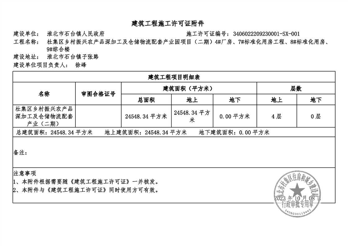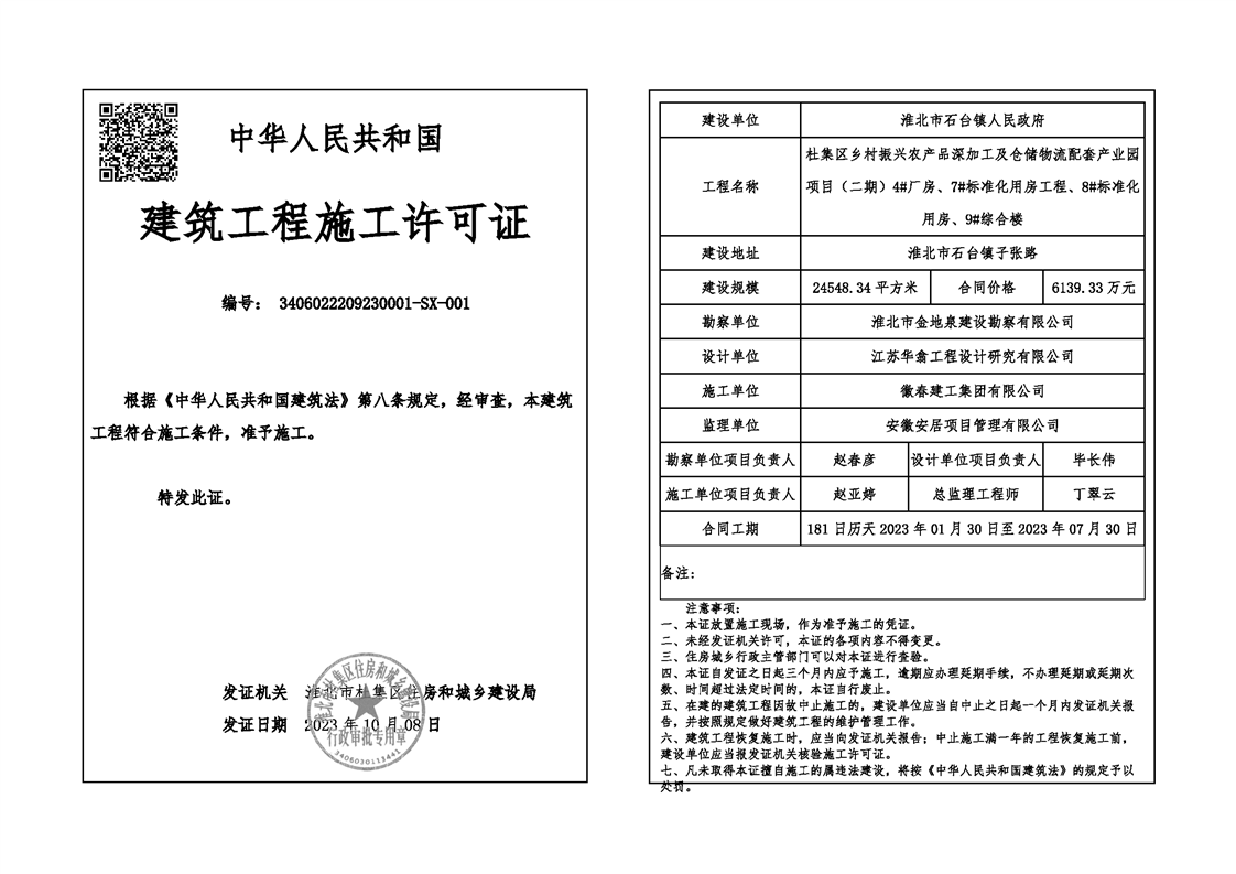 杜集区乡村振兴农产品深加工及仓储物流配套产业园项目(二期)4#厂房、7#标准化用房工程、8#标准化用房、9#综合楼施工许可证