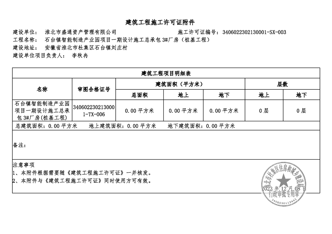 石台镇智能制造产业园项目一期设计施工总承包3#厂房(桩基工程)施工许可证