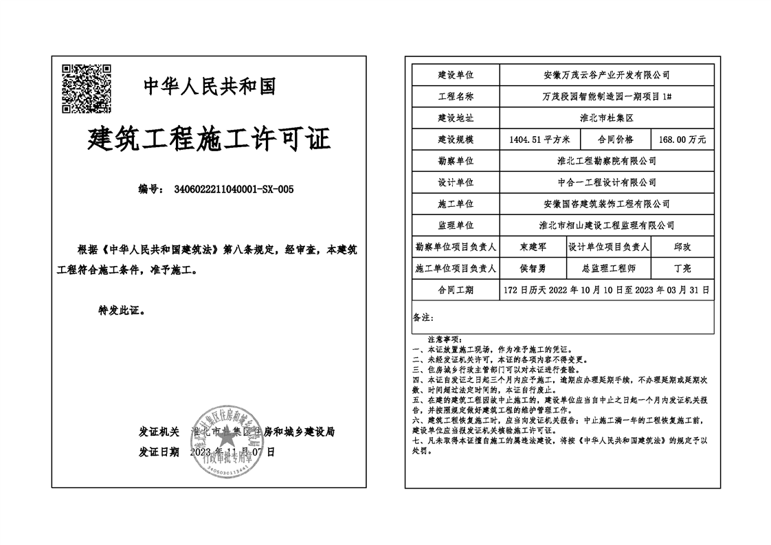 万茂段园智能制造园一期项目1#施工许可证