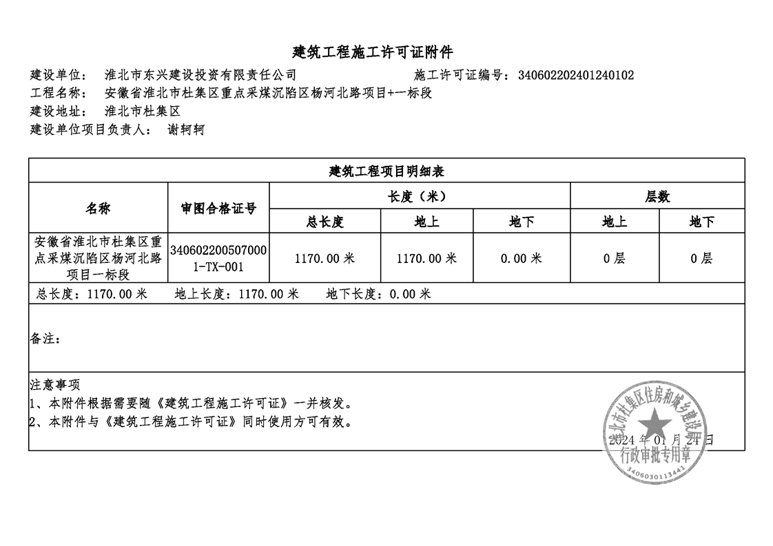 安徽省淮北市杜集区重点采煤沉陷区杨河北路项目+一标段施工许可证