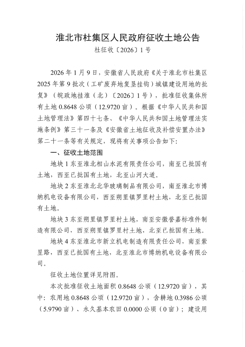 淮北市杜集区征收土地公告(杜征收〔2026〕1号)