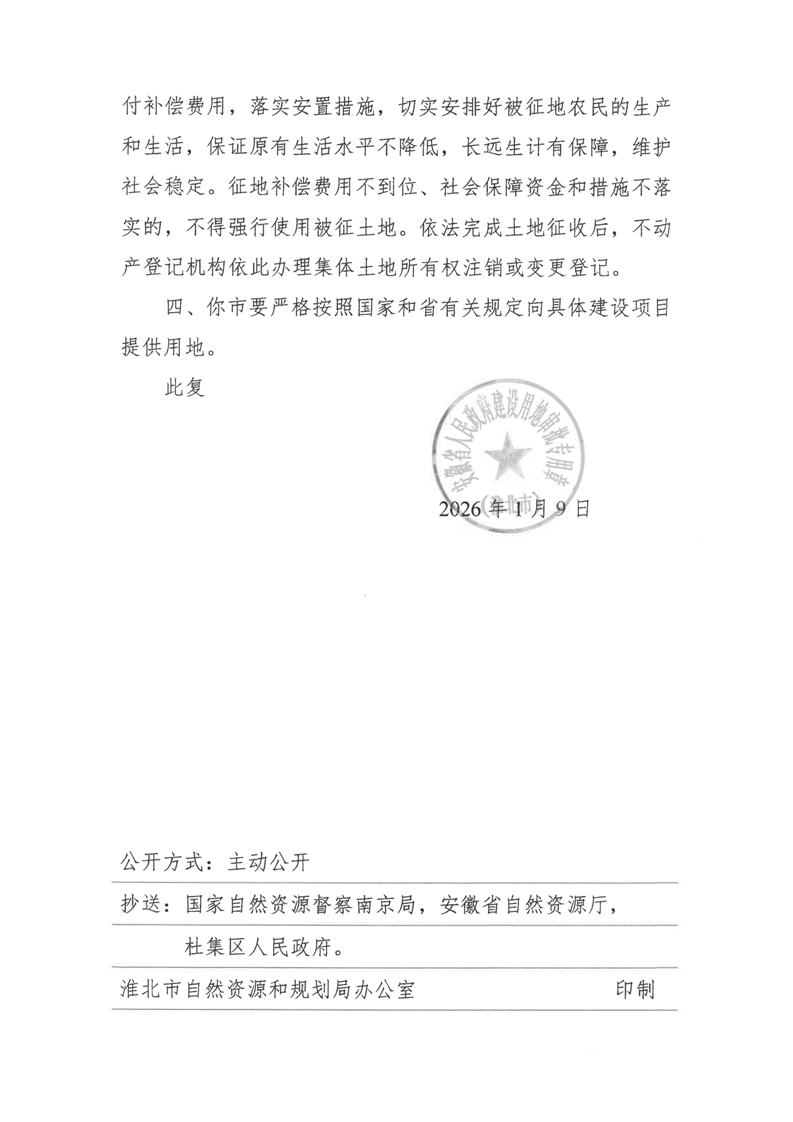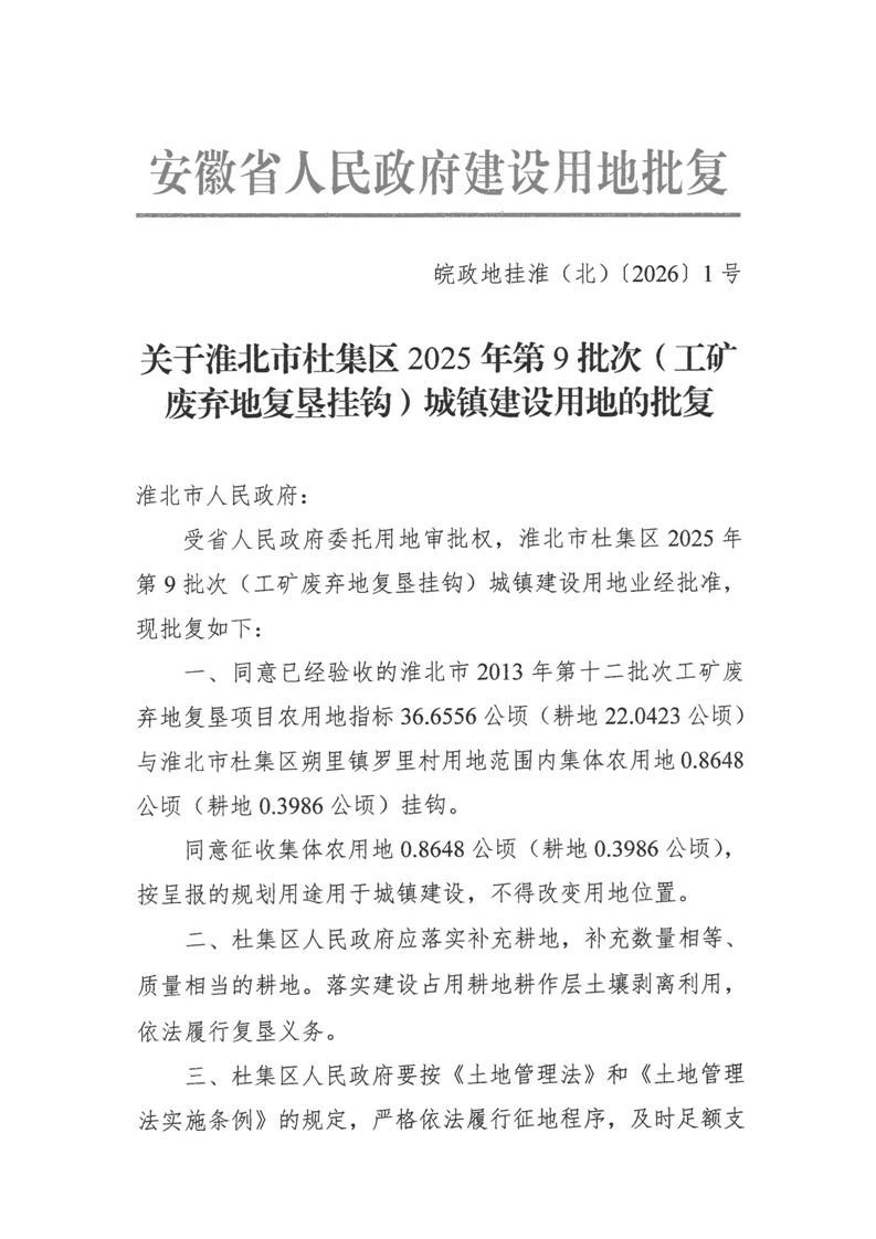 关于淮北市杜集区2025年第9批次(工矿废弃地复垦挂钩)城镇建设用地的批复