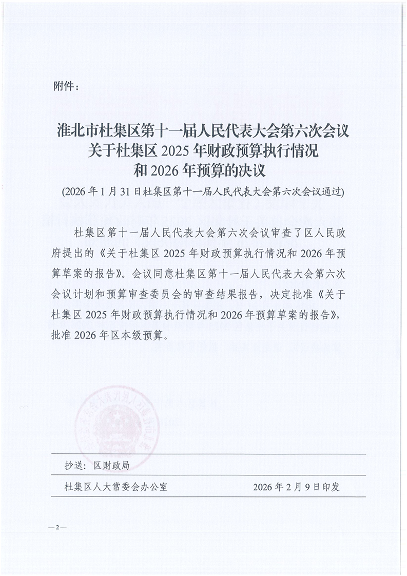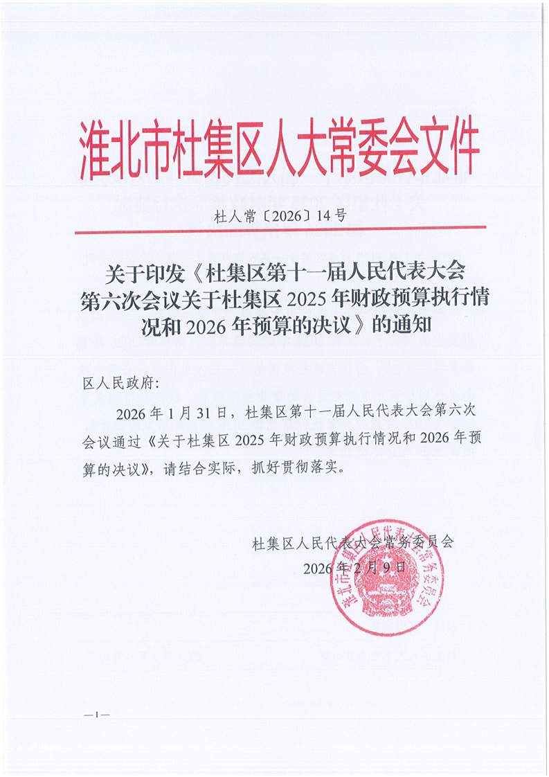关于印发《杜集区第十一届人民代表大会第六次会议关于杜集区2025年财政预算执行情况和2026年预算的决议》(杜人常〔2026〕14号)