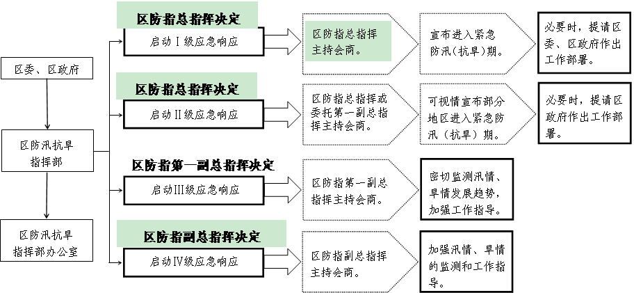 在区委、区政府的统一领导下,防汛抗旱工作实行各级人民政府行政首长负责制。坚持以人为本、安全第一,统一指挥、分级分部门负责,以防为主、防抗救结合,军地协同、全民参与的原则。抗旱用水以水资源承载能力为基础,实行先生活、后生产,先地表、后地下,先节水、后调水,科学调度,优化配置,最大限度地满足城乡生活、生产和生态用水需求。