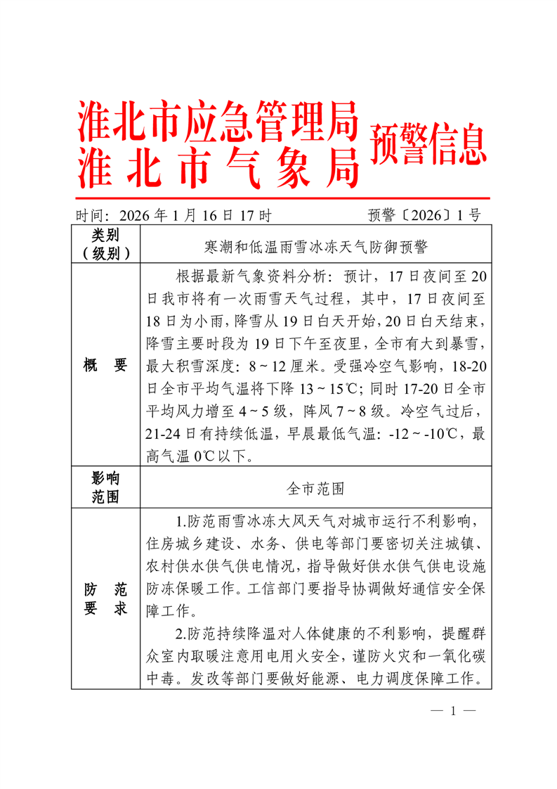 寒潮和低温雨雪冰冻天气防御预警(预警〔2026〕1号)