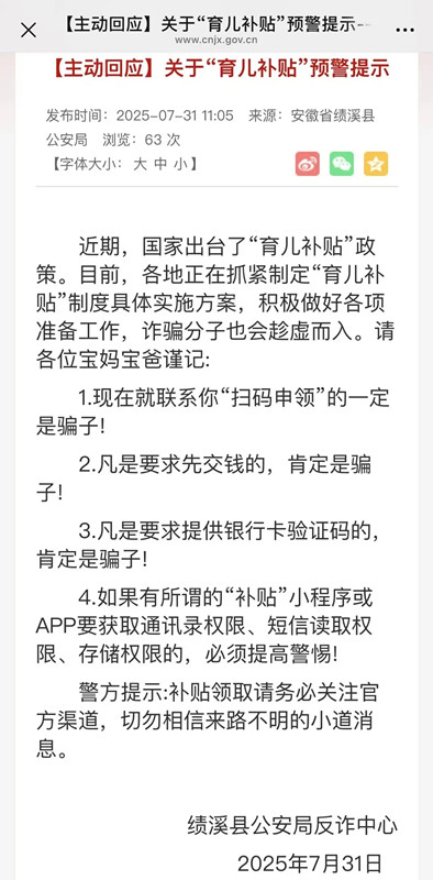安徽绩溪县公安局7月31日发布关于育儿补贴的预警提示