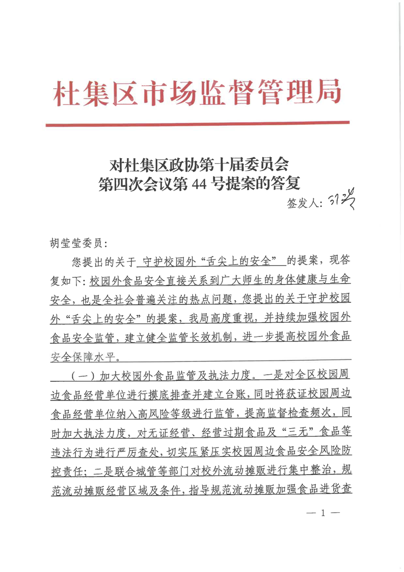 杜集区市场监督管理局对杜集区政协第十届委员会第四次会议第44号提案的答复