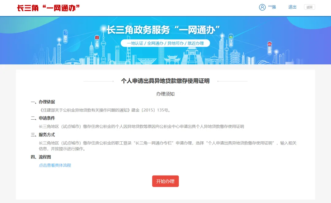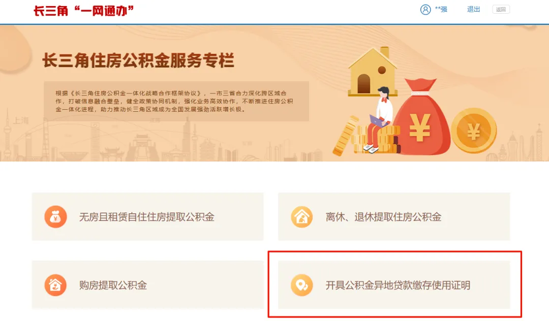 在“长三角住房公积金服务专栏”服务页面找到“开具公积金异地贷款缴存使用证明”服务,点击进入。