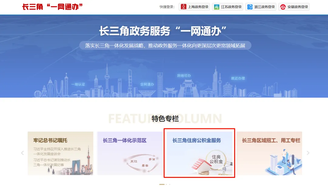 进入长三角“一网通办”平台,在“特色专栏”版块找到“长三角住房公积金服务”,点击进入。