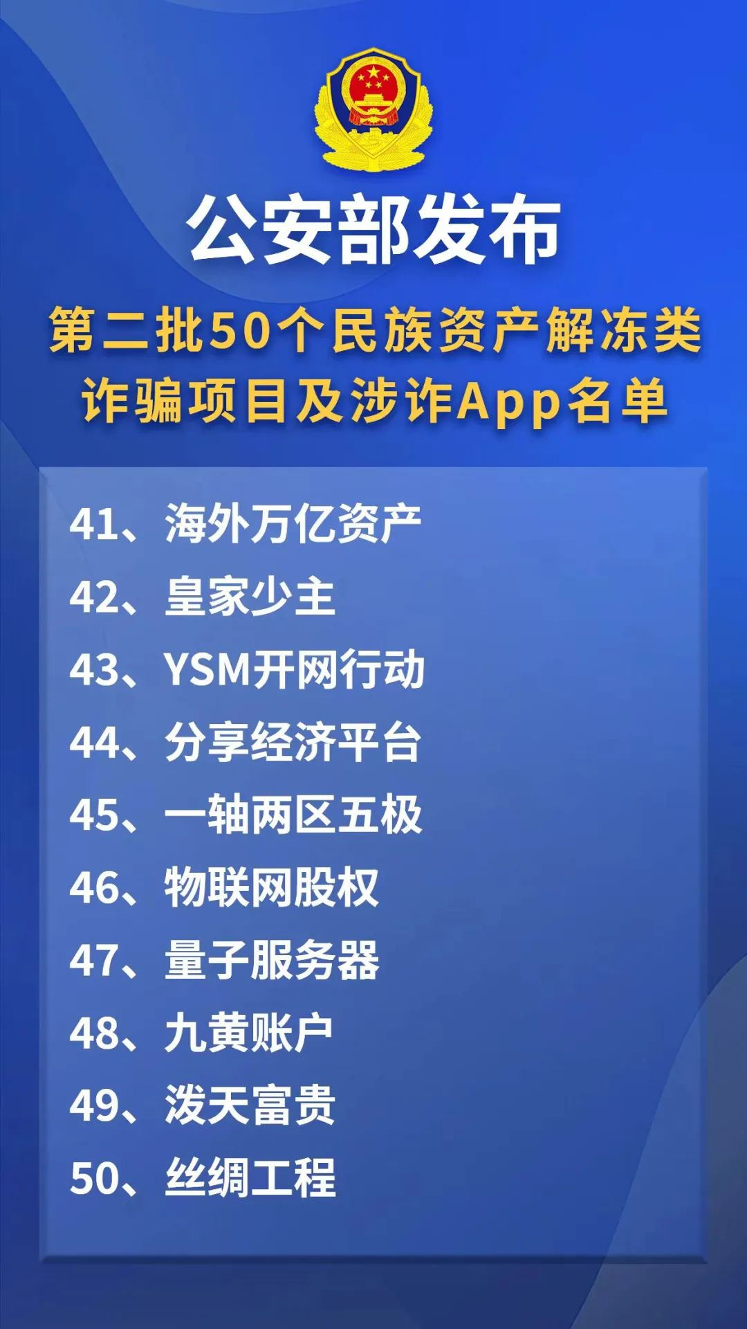 近日,公安部公布第二批50个民族资产解冻类诈骗项目及涉诈APP名单。