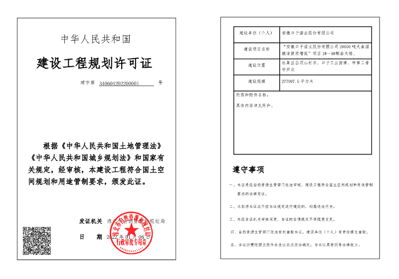 安徽口子酒业股份有限公司20000吨大曲酒酿造提质增效项目建设工程规划许可证(一)