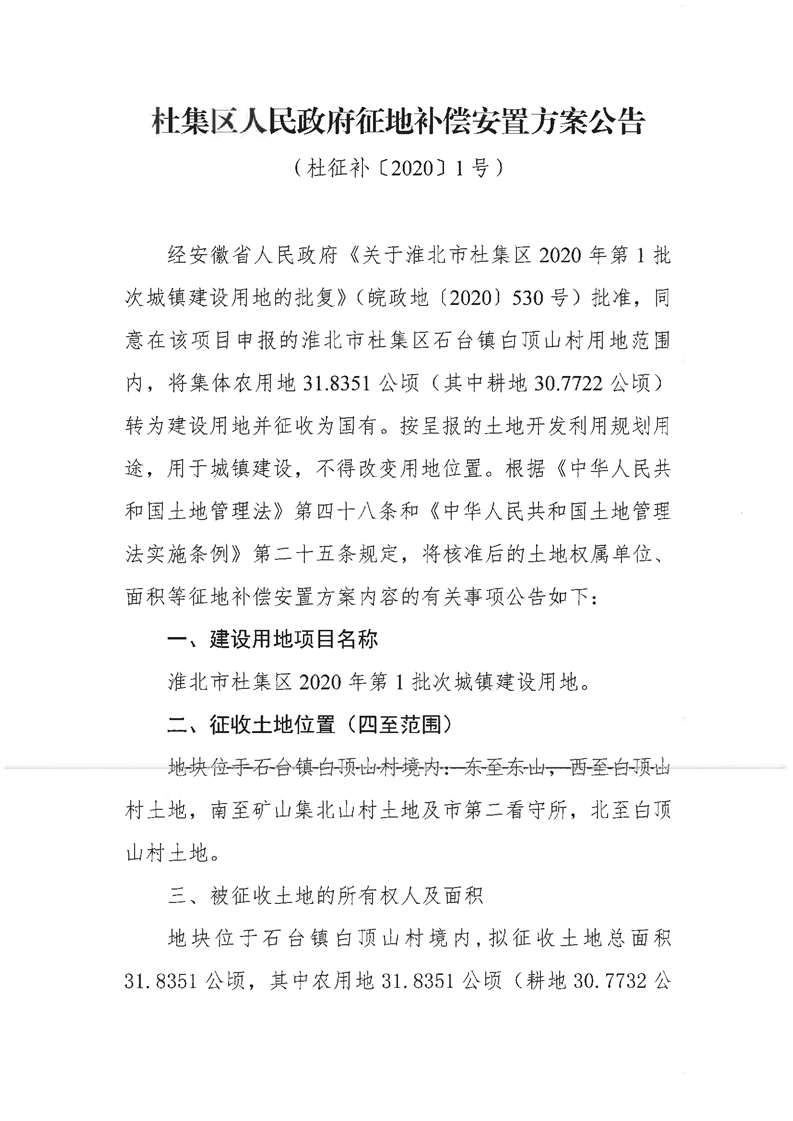 杜集区人民政府征地补偿安置方案公告(杜征补[2020]1号)
