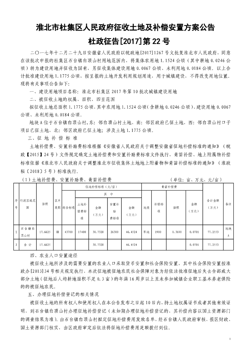 淮北市杜集区人民政府征收土地及补偿安置方案公告