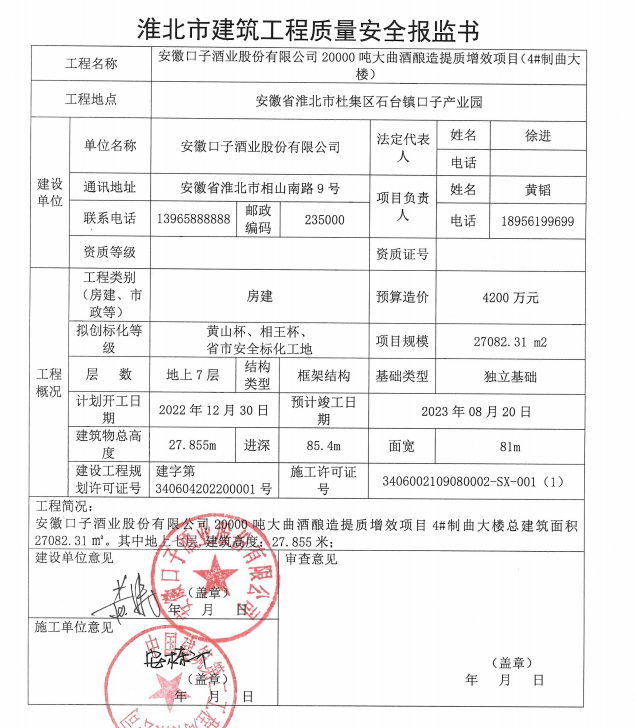 安徽口子酒业股份有限公司20000吨大曲酒酿提质增效项目质量安全报监书(4#制曲大楼)
