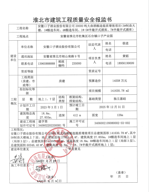 安徽口子酒业股份有限公司20000吨大曲酒酿提质增效项目质量安全报监书(5#制曲大楼,1#、4#酿造车间)
