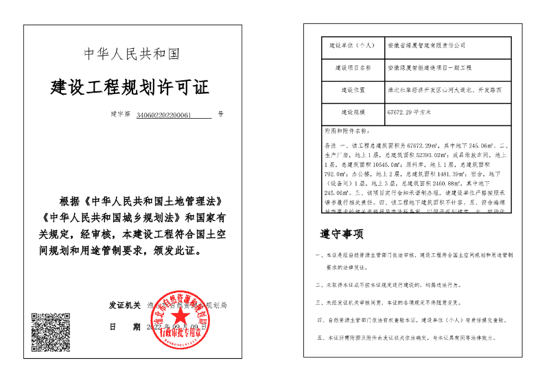 安徽绿厦智能建造项目(一期工程)建设工程规划许可证
