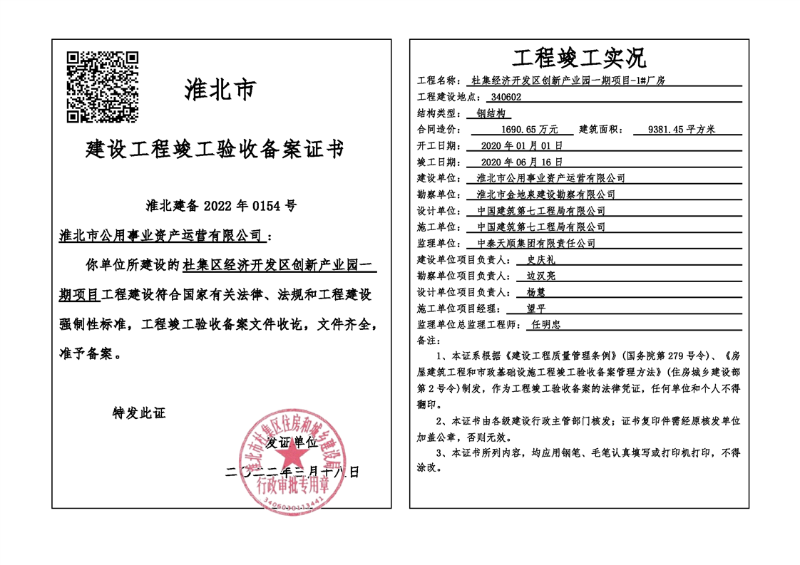 杜集经济开发区创新产业园一期项目-1厂房_竣工验收备案证书
